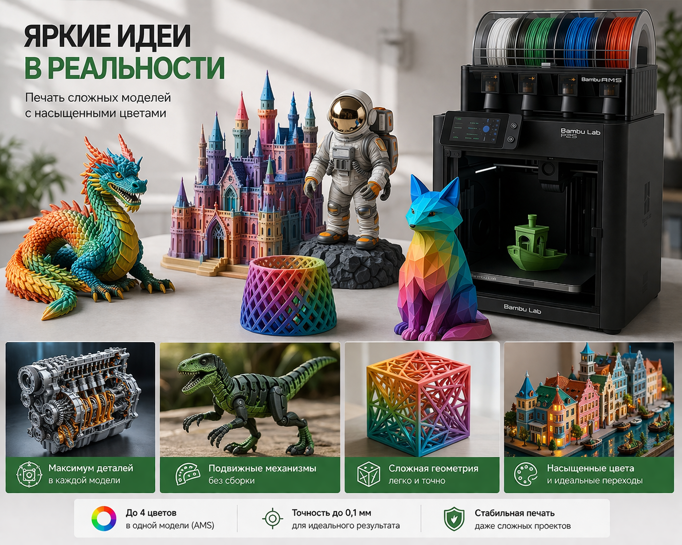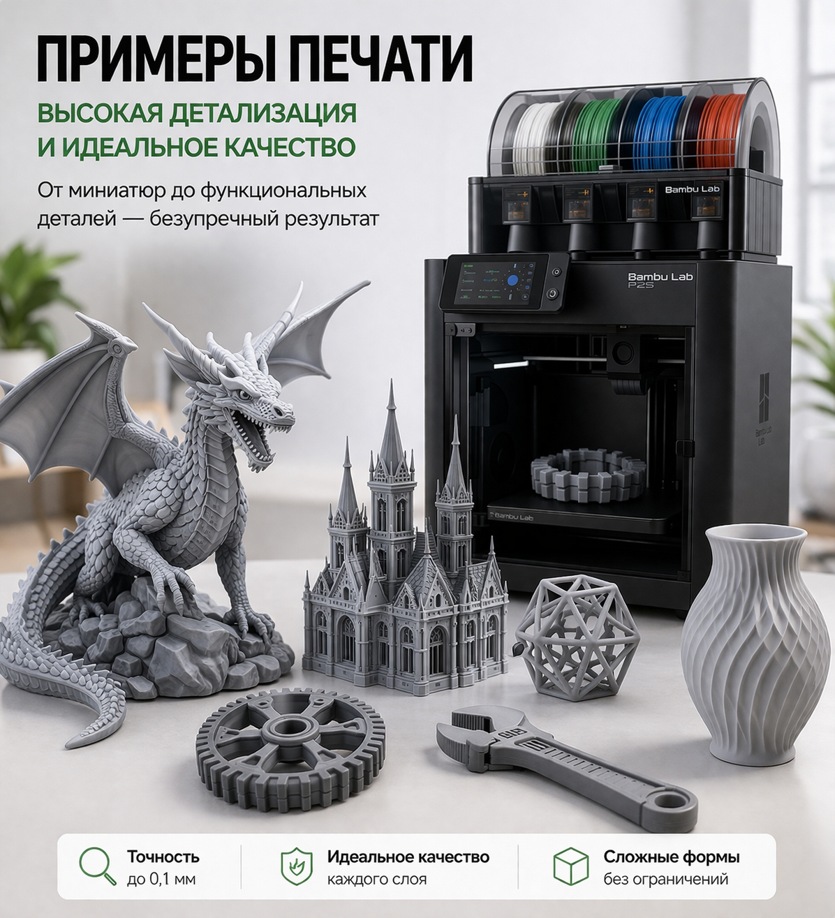 Печатаем детали любой сложности из современных материалов: PLA, PETG, ABS, нейлон, фотополимеры и др.